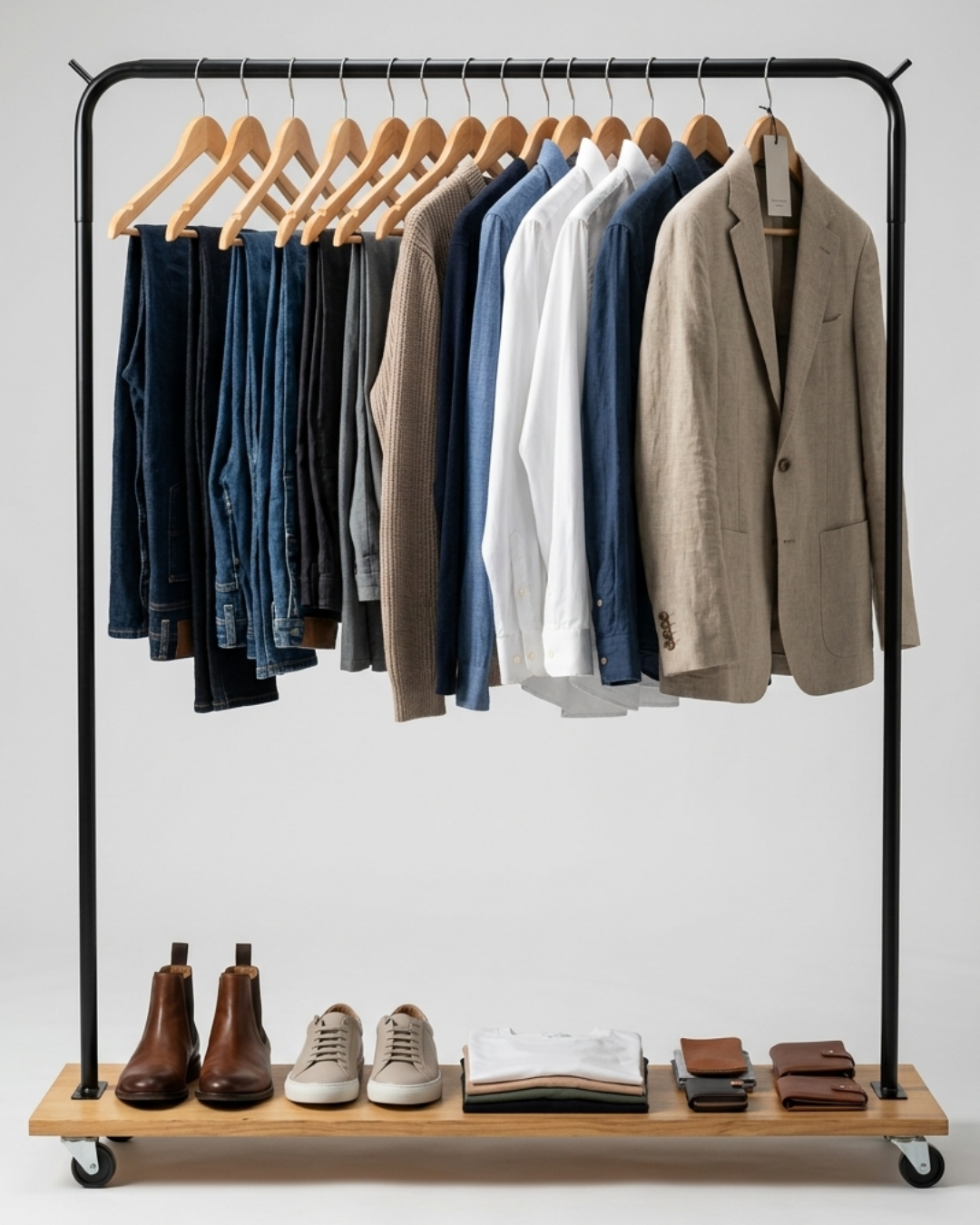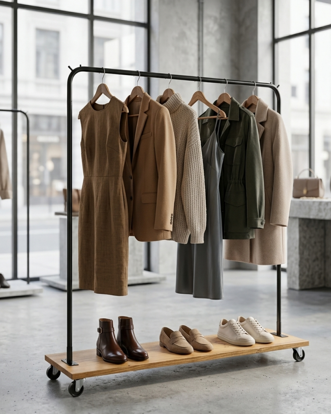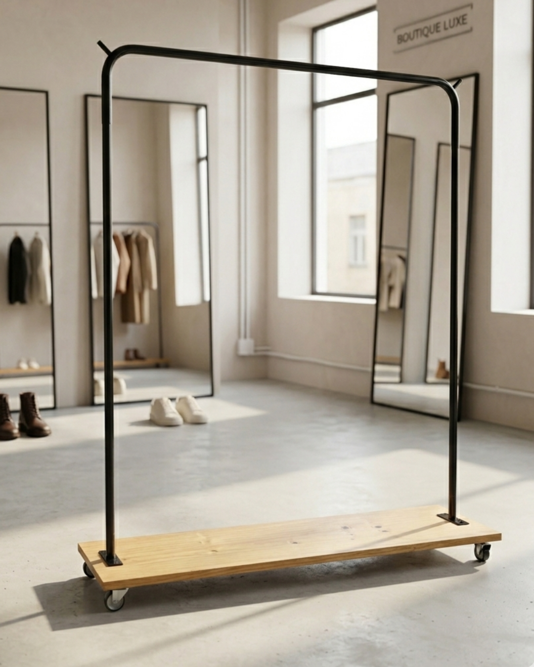 Perchero con ruedas de hierro reforzado + base de madera funcional.