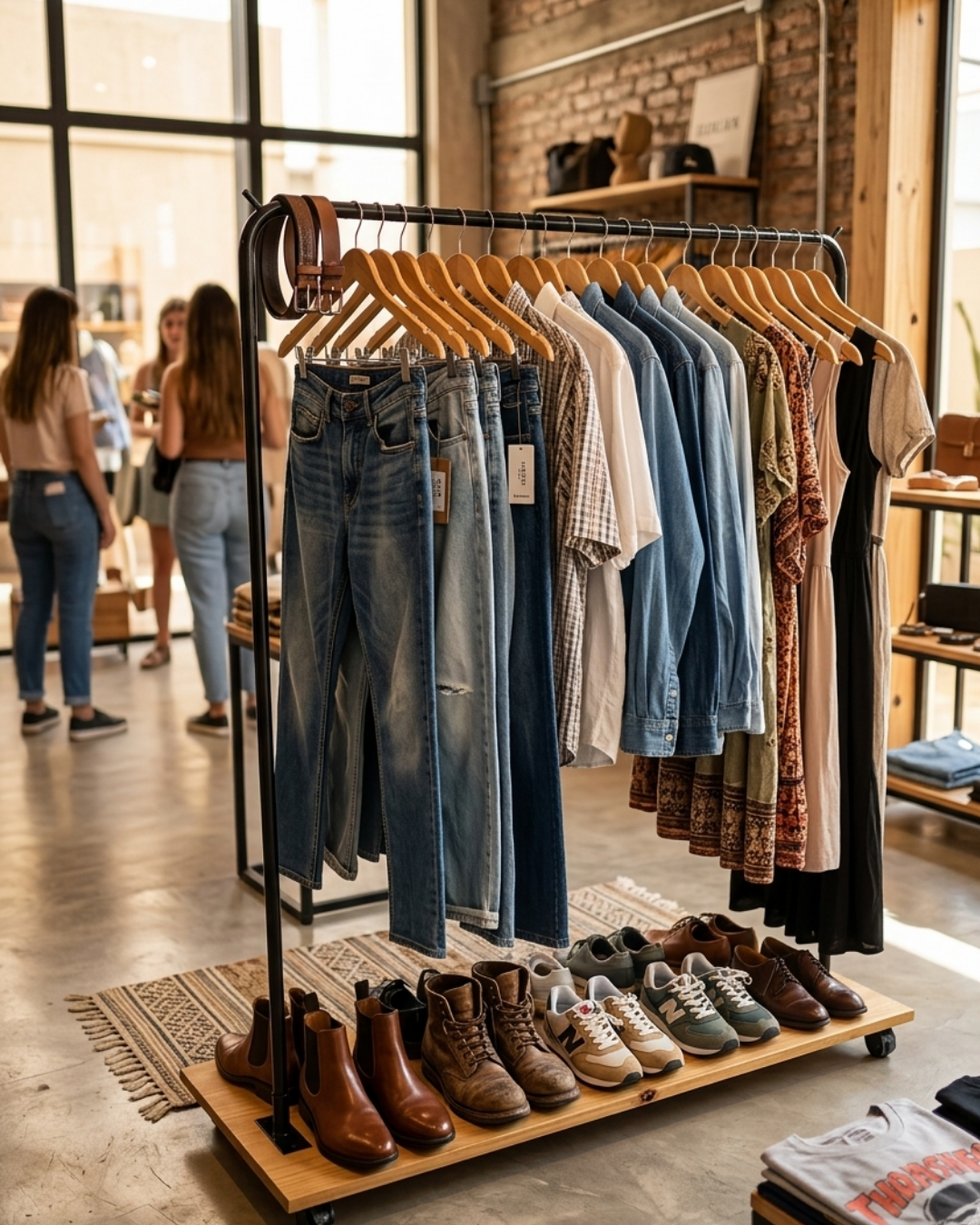 Construido con hierro reforzado, este perchero está preparado para soportar gran cantidad de prendas sin doblarse ni perder estabilidad. Su base de madera maciza de 30 cm no solo aporta firmeza, sino que suma un espacio extra ideal para exhibir zapatos, botas o accesorios, ayudándote a vender más en el mismo espacio.